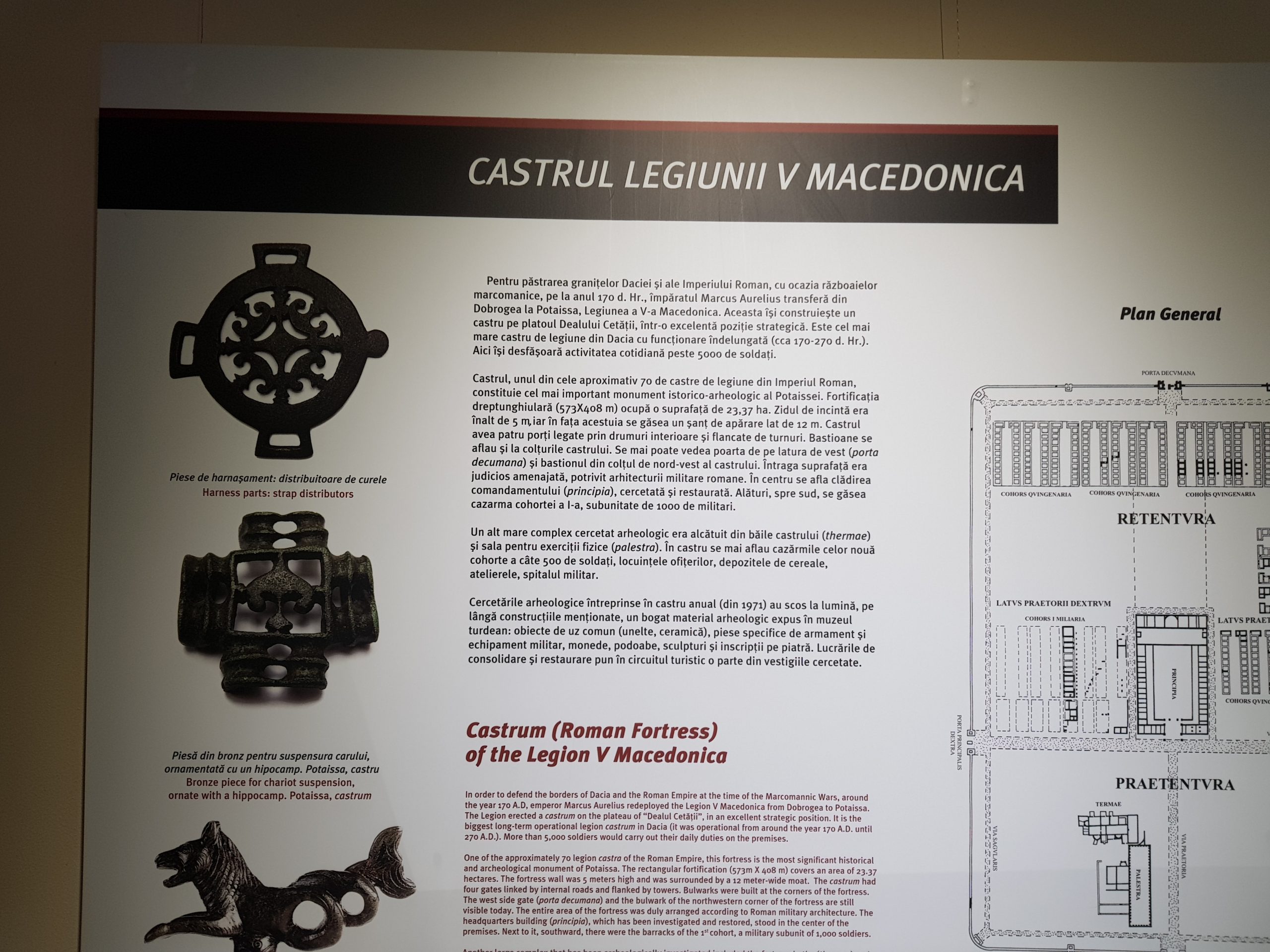 Legiunea V Macedonica a fost cantonată în zona Daciei începând cu războaiele purtate de Traian împotriva dacilor lui Decebal. După încheierea luptelor, în anul 106, aceasta a fost detașată în zona Deltei Dunării. Ulterior, Legiunea V Macedonica a revenit în zona Daciei de nord, participând la campanii împotriva triburilor germanice de la nord și ale sarmaților activi în zona Ucrainei de astăzi. Cu baza în Potaissa, legiunea a rămas în zonă în mare parte din secolele II și III. Castrul pe care și l-a construit este cel mai mare castru de legiune cu funcționare îndelungată din Dacia. Aici își desfășurau activitatea peste 5000 de soldați.