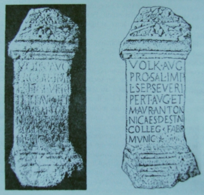 Traducerea inscripției de pe altar este următoarea: ”Zeului Volkanus Augustus, pentru sănătatea împăratului Lucius Septimius Severus Pertinax augustul și a lui Marcus Aurelius Antoninus cezarul, destinat colegiului meșteșugarilor municipiului...”.